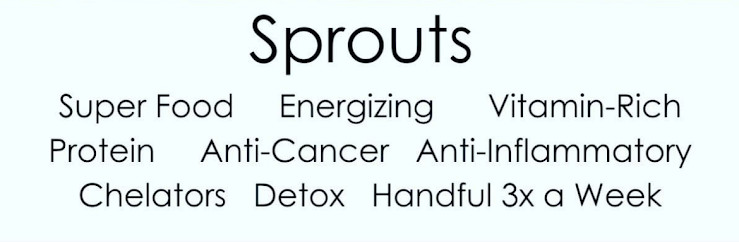 Sprouts are an amazing adjunct to any diet. They are a super food that’s rich in vitamins, enzymes, life, and antioxidants. They’re easily digested and packed with protein. Sprouts help fight cancer and are very energizing. Try them on sandwiches, salads, or as a garnish to soups. They are flavorful and fun! Sprouts help with chelation, which is removal of toxins from the body. Cleaning our body is important as it gets dirty, just like our house does!